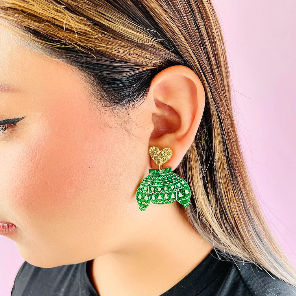 🎅 Aretes Suéter de Navidad – Llévate el espíritu navideño con estos aretes en forma de suéter, hechos de acrílico y pintados a mano en rojo, verde y azul.