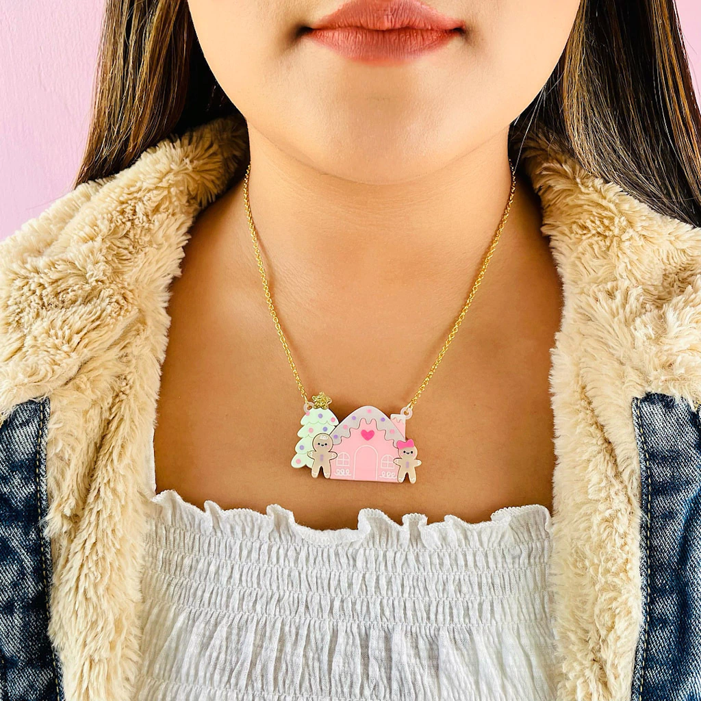🎄 Collar casita de jengibres navideña – Celebra la magia de la Navidad con este collar artesanal pintado a mano, que presenta una adorable casita de jengibre acompañada por una pareja de jengibres en suaves colores pastel.