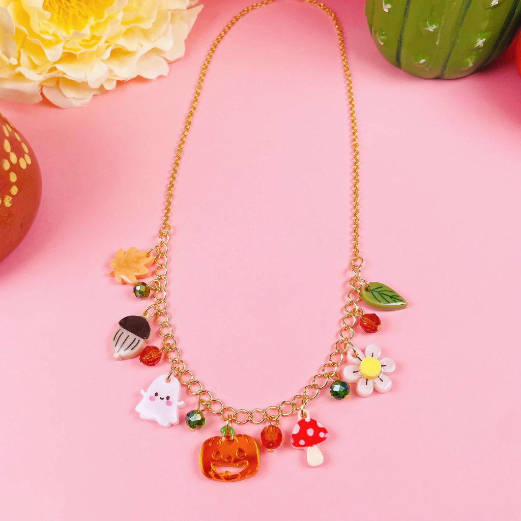 🍁 Collar Otoño con Charms: Celebra la temporada con un accesorio femenino y elegante. Este collar incluye charms encantadores como calabazas, fantasmas, flores y cuentas en colores cálidos de otoño, perfectos para Halloween. ✨ Diseño artesanal y delicado, con cadena de chapa de oro hipoalergénica.