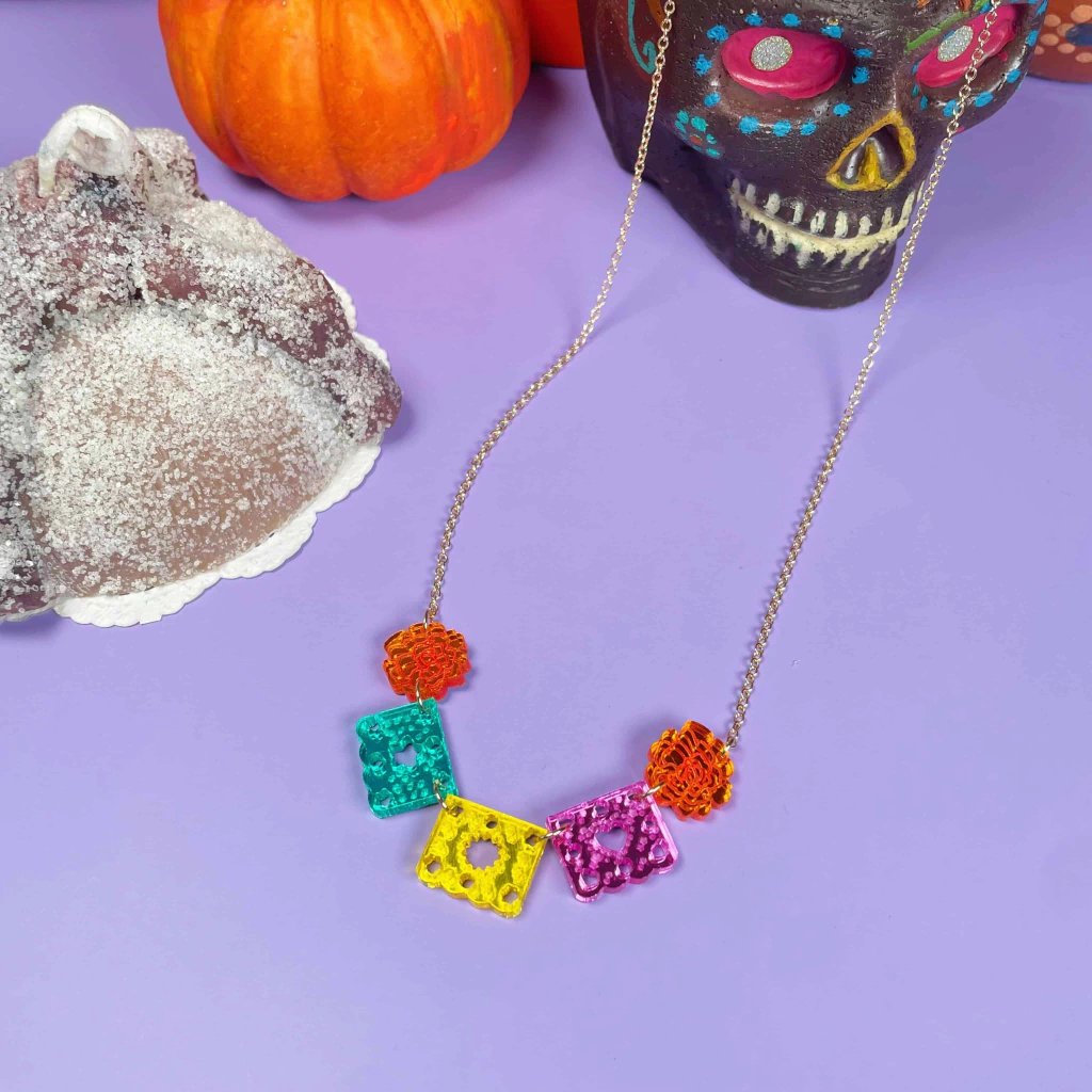 Completa tu look en este Día de Muertos con nuestro collar de papel picado y cempasúchil. Añade un toque festivo y tradicional a tu vestimenta y celebra de manera auténtica. ¡Demuestra tu amor por la cultura mexicana con este accesorio único!