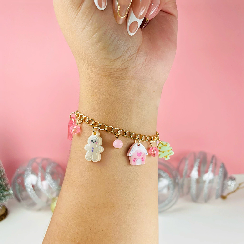 🎀 Pulsera de galleta de jengibre – ¡Celebra una Navidad súper girly con esta encantadora pulsera! Incluye charms navideños como copo de nieve, guante y bastón en tonos pastel, ¡perfectos para regalar y sorprender a tu persona especial!