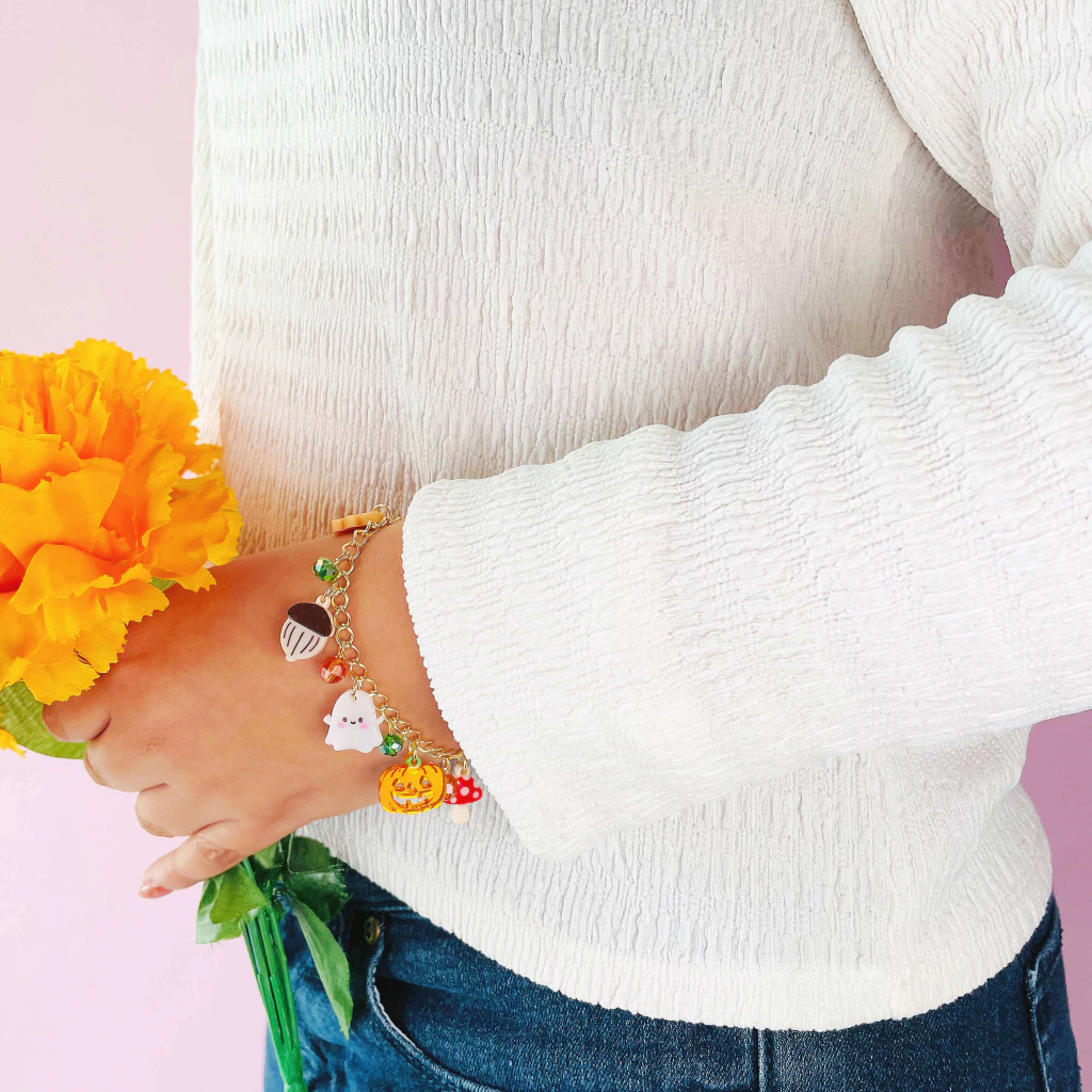🍁 Pulsera Otoño — El accesorio ideal para esta temporada. Esta delicada pulsera cuenta con hermosos charms que incluyen calabazas, fantasmas y flores otoñales en colores que evocan el espíritu del otoño. Perfecta para lucir en Halloween y complementar tus looks con un toque encantador y festivo. ✨ Diseño artesanal, ligero y muy bonito, hecho para acompañarte siempre con estilo.